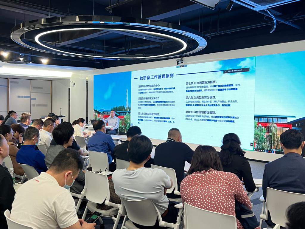 卢坤建作了重要讲话。首先,他指出,教研室是学校从事教学和研究的基本单位,是学校服务的基本对象,是学校标志性成果创造、服务社会的根本力量。其次,他强调,当前教研室存在三大根本性问题:研究性不够、规划性不高、特色性不强,因此要从两个角度做好教研室建设:一是“走进教研室看”,二是“跳出教研室看”,一定要围绕学生的成长“赋能”与“服务”,做好专业赋能、课程赋能和教师赋能,促进产教科有效融合。教研室应该胸怀学生培养全局,胸怀教师发展主线,抓住教师建设核心,全面系统推进相应工作,打造品牌特色、夯实内涵建设、培养合格人才。最后,他要求,规范教研室建设要从规范教研室内涵抓起、从运行机制抓起、从二级单位党政办更为有效承接行政事务性工作抓起、从全校上下全力支持教研室日常运行工作抓起,为实现学校高质量发展而进行体系性、全局性、长远性改革建设。