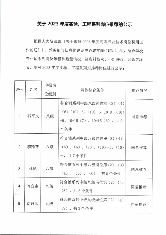 关于2023年度实验、工程系列岗位推荐的公示