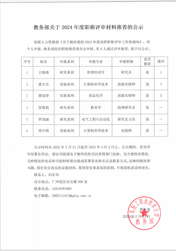 教务部关于2024年度职称评审材料推荐的公示