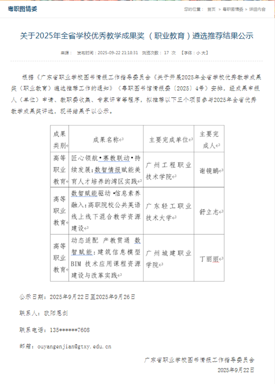 关于转发广东省职业学校图书馆情报工作指导委员会《关于2025年全省学校优秀教学成果奖 (职业教育)遴选推荐结果公示》的通知