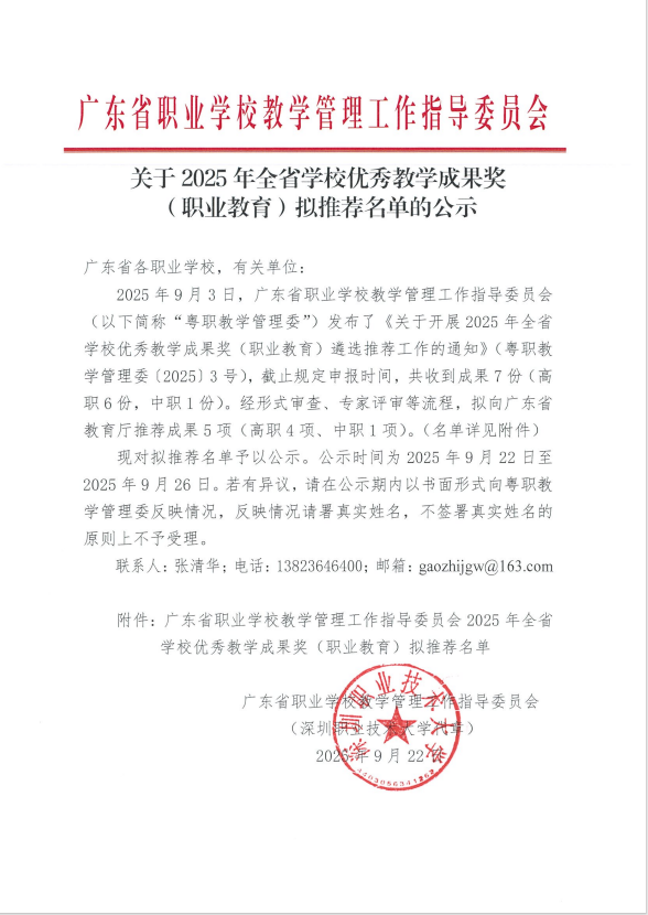 关于转发广东省职业学校教学管理工作指导委员会《关于2025年全省学校优秀教学成果奖(职业教育)拟推荐名单的公示》