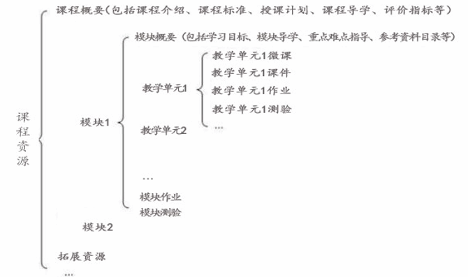 1.课程建设应该按照课程概要、课程模块/课程章节/课程项目、教学单元/教学任务、教学资源来组织,资源包括有课程介绍、课程标准、授课计划、教学课件、课程导学、评价指标、重点难点指导、作业、测验、参考资料目录和微课等教学活动必需的资源以及拓展资源等。原则上每门课程的所有教学单元均需拍成微课,并制作每一个教学单元的课件、作业及测验,使得校级精品在线开放课程适合学生线上自主学习,具体结构可参照下图:
